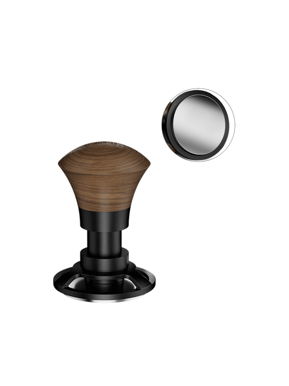 The 58.35 mm base rests evenly on the rim of any standard 58 mm portafilter, ensuring a level, repeatable tamp. The body is constructed from stainless steel and anodized aluminum for durability and corrosion resistance. The walnut wood handle offers a secure, ergonomic grip for all-day use.